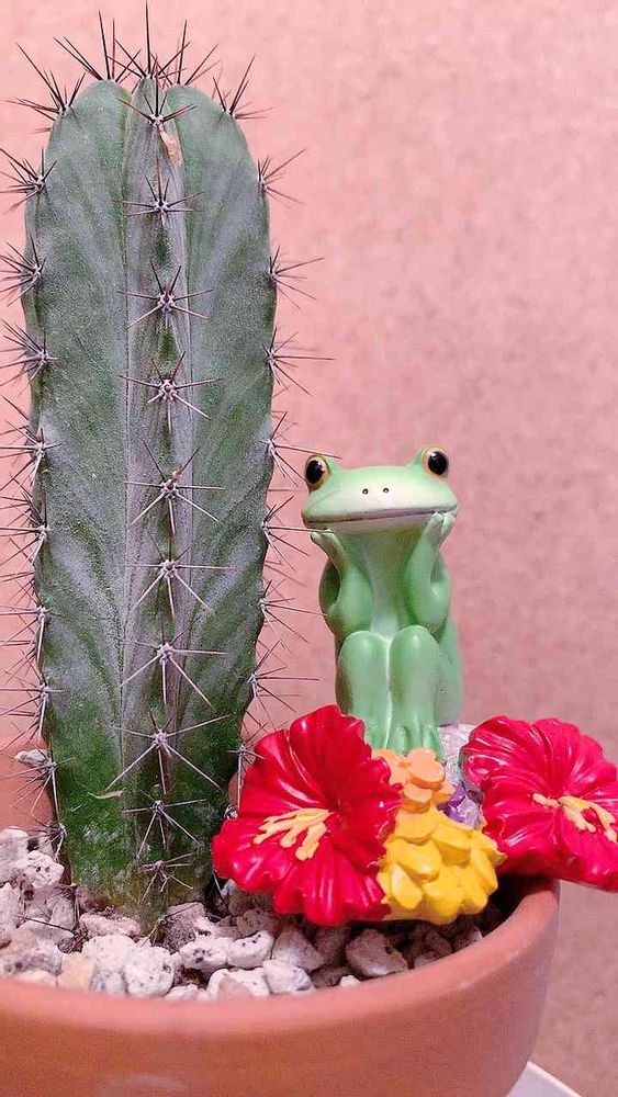 コポタン、ほおづえついて可愛い🐸サボテンによりかかりたいけど、怪我をするから出来ないですね😁