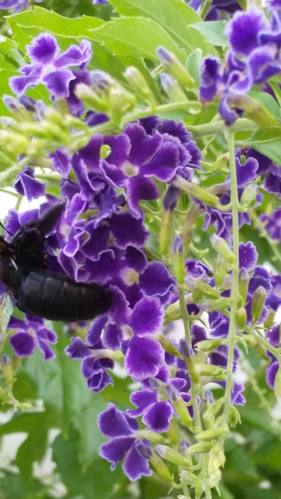 通勤帰り、スミレ色のお花「デュランタ宝塚」にてクマバチさんが食事中です。💜🌿🐝😊😄🙆