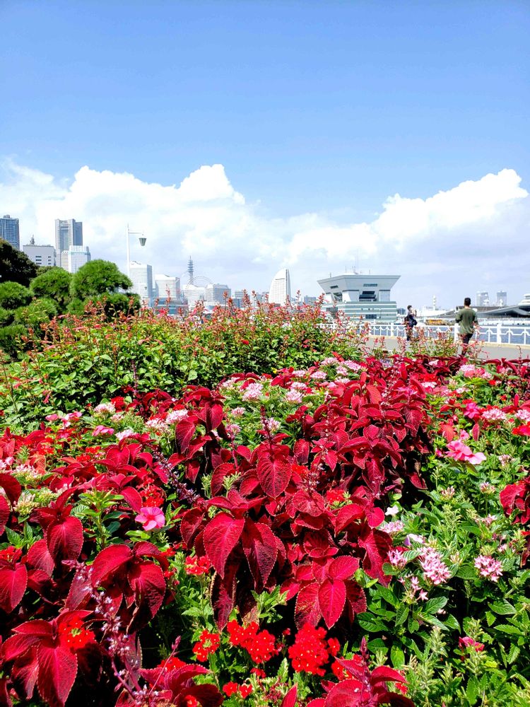 花の向こう中心に船の帆のような外観のホテル🏨インターコンチネンタルホテル、右側税関大桟橋左側観覧車、ランドマークタワーが等見えてます✨