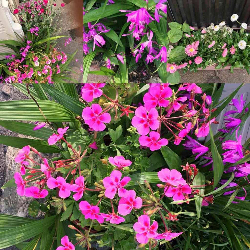 私の狙い通りに。私は父かデイサービスの職員が迎えに来た時に、多分、玄関の花が綺麗ですねぇ、と褒められる事を想定して、華やかなペラルゴニウムを置いて去ったのですが、昨年の秋に置いて行ったやはりピンクのゼラニウムも寒さにビクともせずに生き残り、こんなに美しい花を咲かせたのです。しかも、紫蘭も咲いてるし、ゼラニウムとペラルゴニウムの真ん中には麦仙翁って言うのかなぁ?またまたピンクの花を父が自分で植えていました。