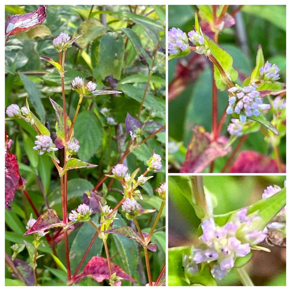 夏は緑で花も白く目立たなかったのに、花はパープルがかり、葉も紅葉してきた感じです、タニソバでしょうか、薮のように茂り出してます。