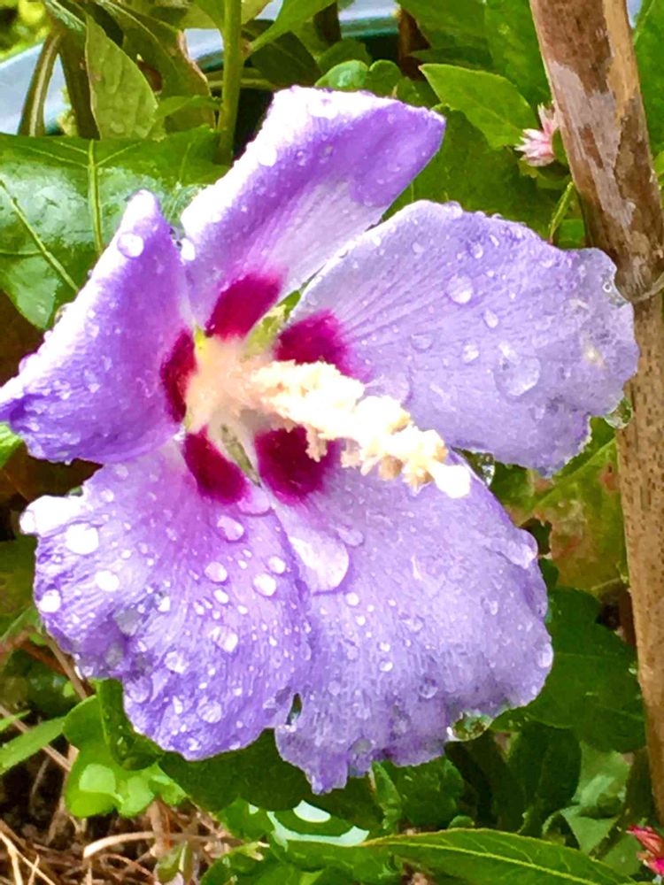 一日花のムクゲさんがまた綺麗に咲き、雨にすっかり濡れていました。