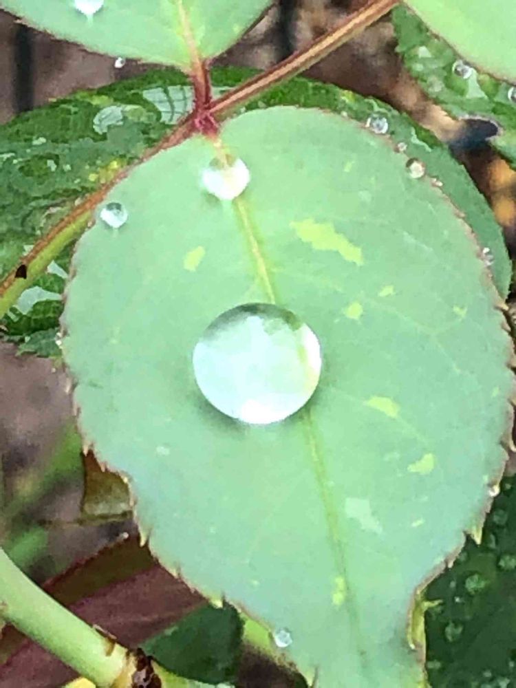 薔薇の葉っぱに水滴があってまるで、キラキラした宝石のようでした〜。少し風が吹いたら転げ落ちそうで、そうなる前にパチリ✨