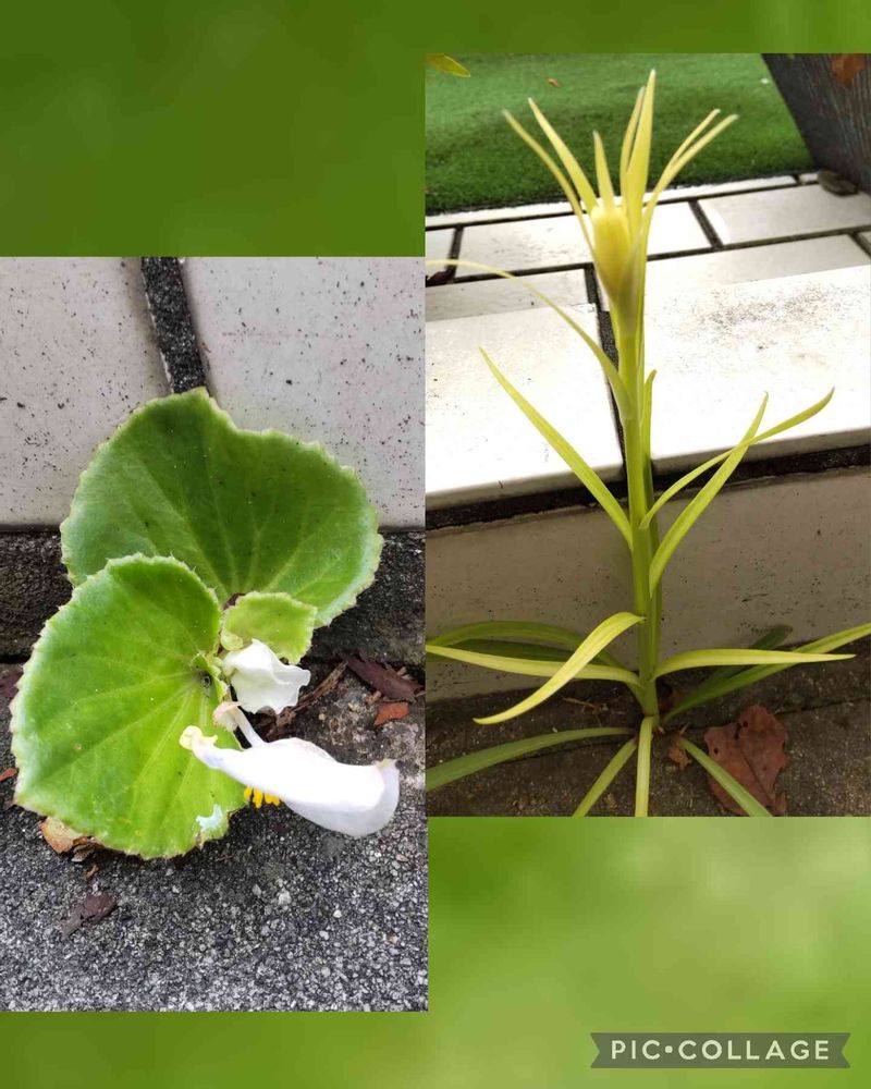 ㊧駐車場のコンクリートの割れ目から生えていたこぼれ種のベゴニアにお花が咲きました🎶