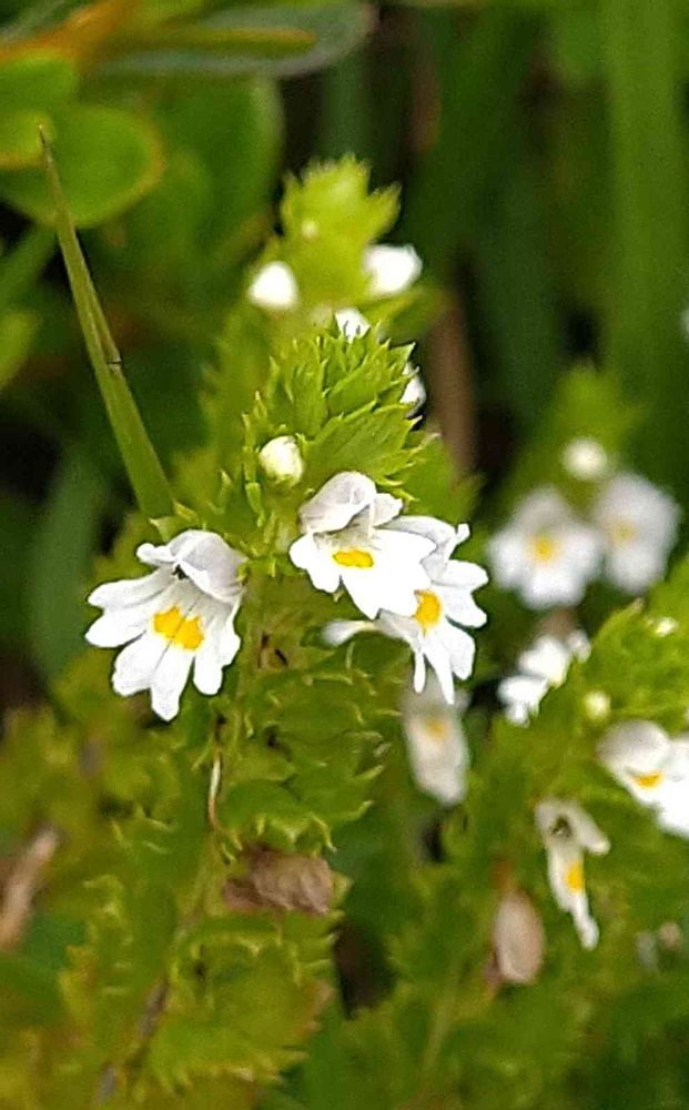 草の高さは20センチ位、花冠は唇形で長さ8ミリ位です。上部の葉の付け根に1個ずつ白い花をつけ、下唇の奥に黄色の斑点があって可愛い顔をしています💛💛💛