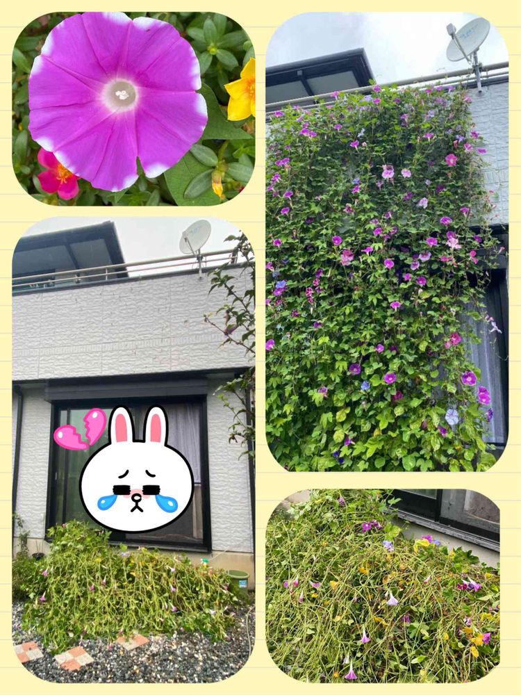 数十分前に、突然、朝顔のグリーンカーテンを釣っていた紐が、切れて落ちました😱