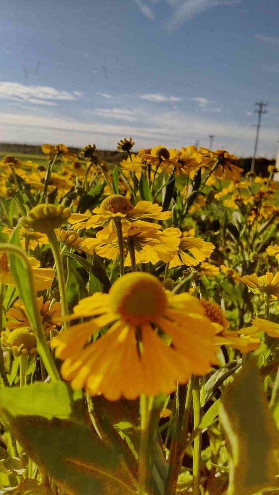 綺麗な🟦空に🟡ビタミンカラーのヘレニウム🟡さんめちゃめちゃ咲いて😊