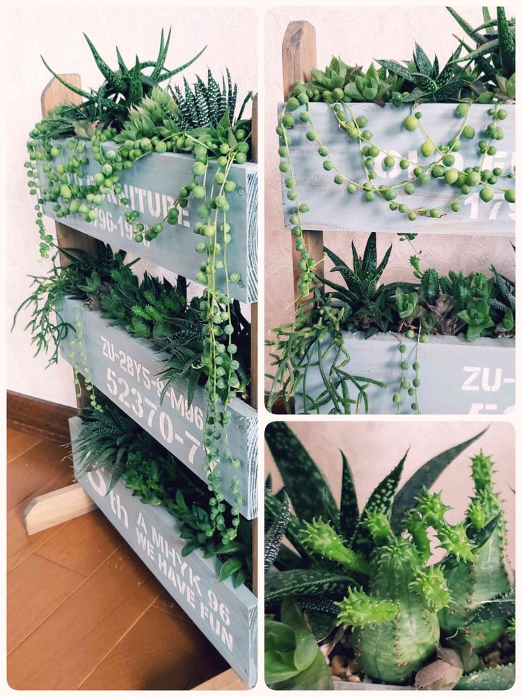 多肉な彼女さん作の三段プランターのグリーンネックレスが、長くなってきました。😄🎶