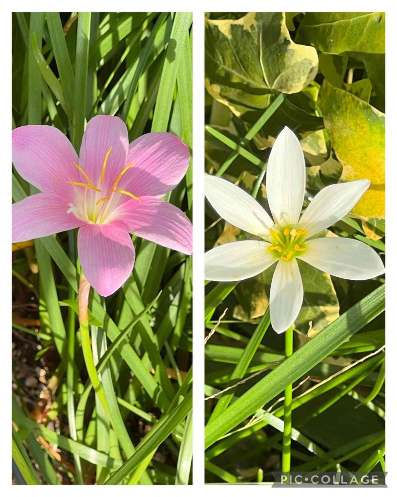 植えてみたら、ピンクのサフランモドキと、白こ黄色のタマスダレが咲きました。