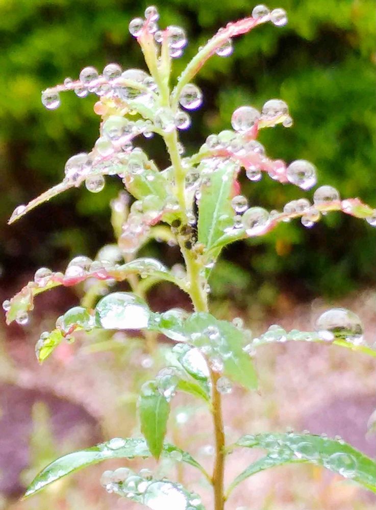 雪柳の🌿に露ではなく雨粒🌧