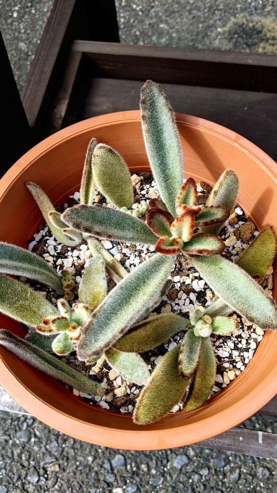 カランコエ テディベア&黒うさぎ。胴切りして新芽もりもり。黒うさぎは成長早め、テディベアは芽数多め。葉挿しももりもり成長してモケモケかわいいねえ