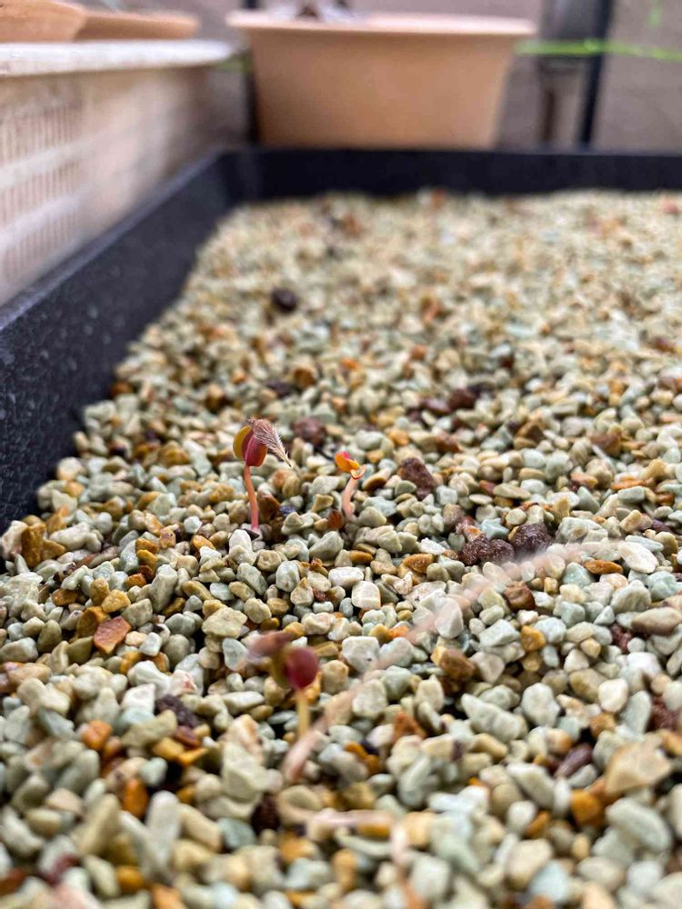 サルコカウロンのバンディリティエ、60個位タネ出来たので撒いてみました。日曜昼からなので3日位で芽🌱が出ました。