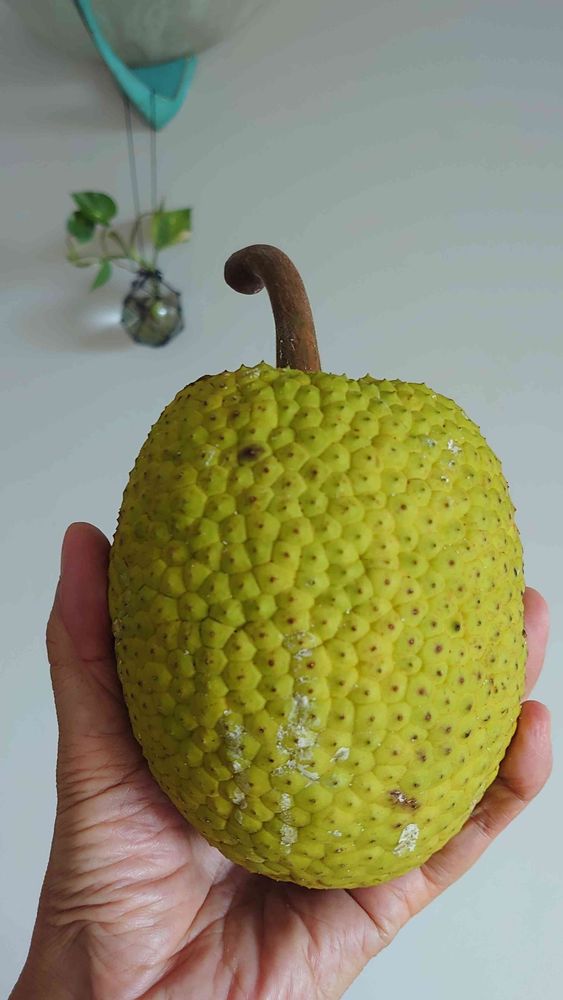 これはソフトボールよりちょっと大きいって感じですが、普通サイズと思われる大きさはハンドボールぐらいかな〜。くし切りにして蒸して、中心部の種の部分を切って皮を剥いて食べやすい大きさに切ってからココナッツミルクと砂糖で煮るつもりです。🤗💚