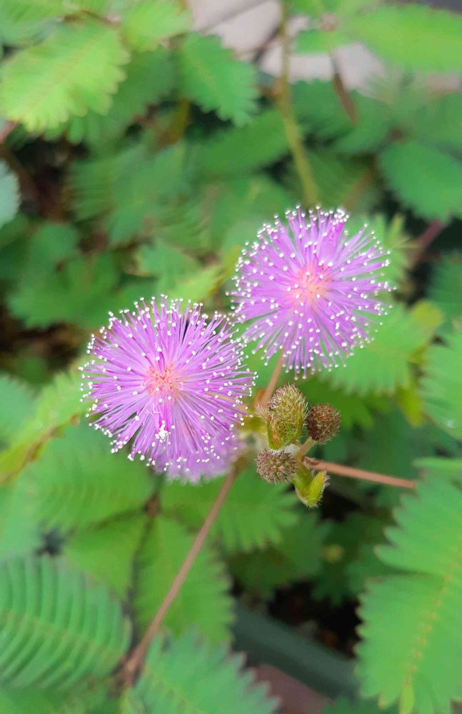 雨のなか、おじぎ草の花が4つも咲き始めました✨長女がまいてくれたおじぎ草です😊