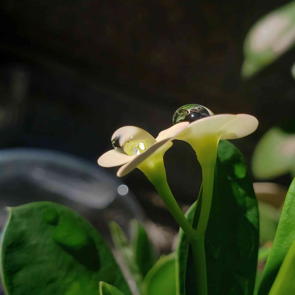 夜中に降った☂️の雫が💧💧2つ並んだ可愛いハナキリンの上に💕まるんまるんと乗っかってました🤣朝日の眩しいベランダです🤭朝撮りました🙏