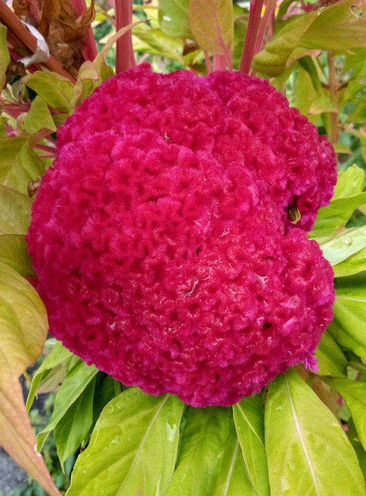 通りすがりに見かけました、とある駐車場の花壇に咲いていました、赤いケイトウの花☺️
