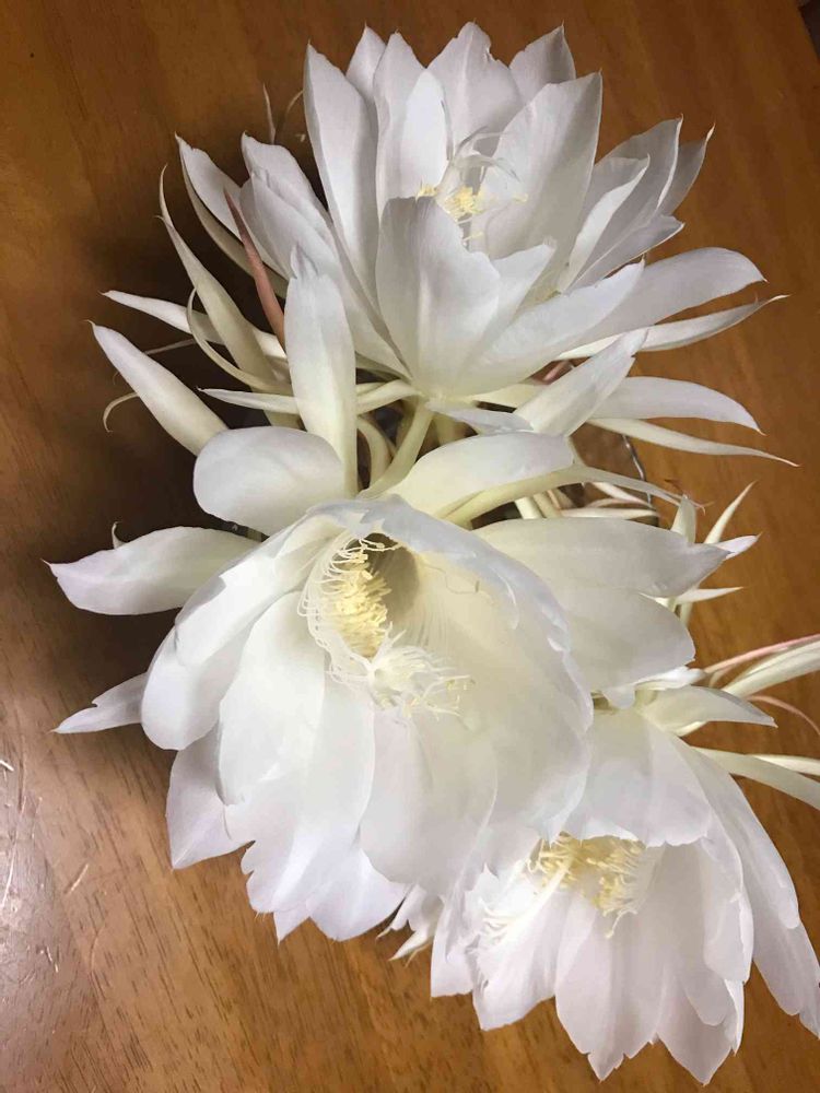近所の花友のおじいさんにもらった月下美人の株に花芽がついたと思ったらあっという間に咲きました。ちーーっちゃい花芽を見つけた時は冬が来る前に咲くんだろうかと思ったけど、すごいスピードででっかい蕾になって咲いてしぼみました。