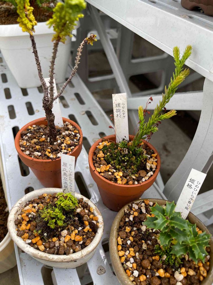 今日、散歩した公園に露店でてました。つい、衝動買い、、、ミニ盆栽にします。石化桧、螺旋杉、屋久島立浪草、姫柊です。