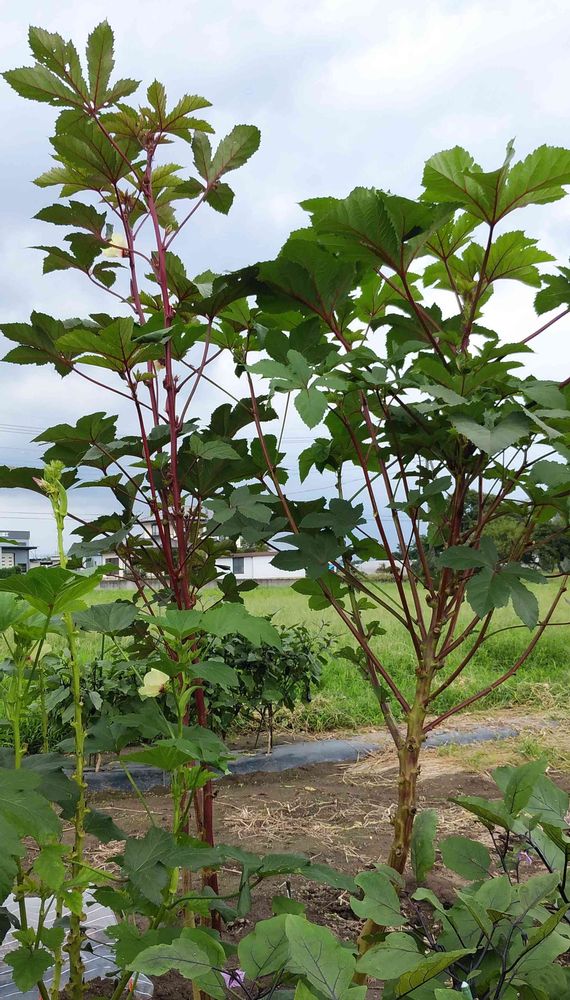 左側にあるのが普通のオクラで十分に背が伸びているのに、赤いオクラは2mをはるかに超え巨木となってしまいました🌳