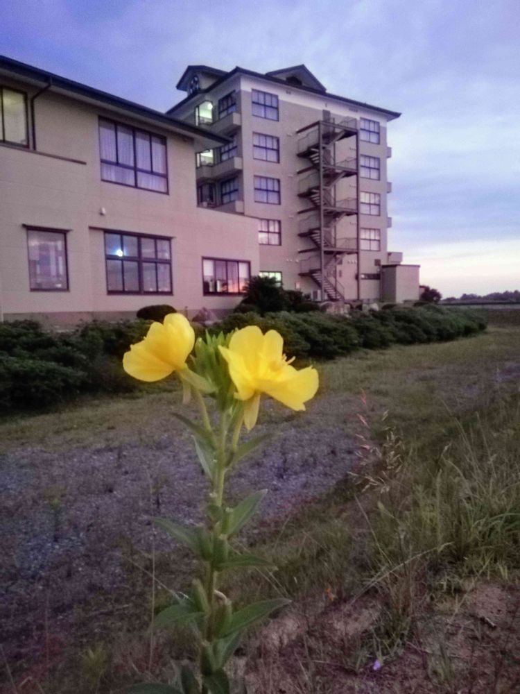 朝焼けの中🌊🌅、ちょっと感傷的気分での朝の一人歩きで見かけたマツヨイグサ。