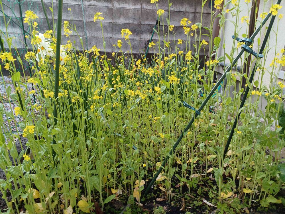 珍しく、かつお菜の種を見つけて花壇にまいてみたら葉を収穫後こんなになりました。春の画像です。
