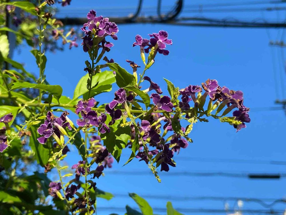 見上げるような高い梢に咲くデュランタ。