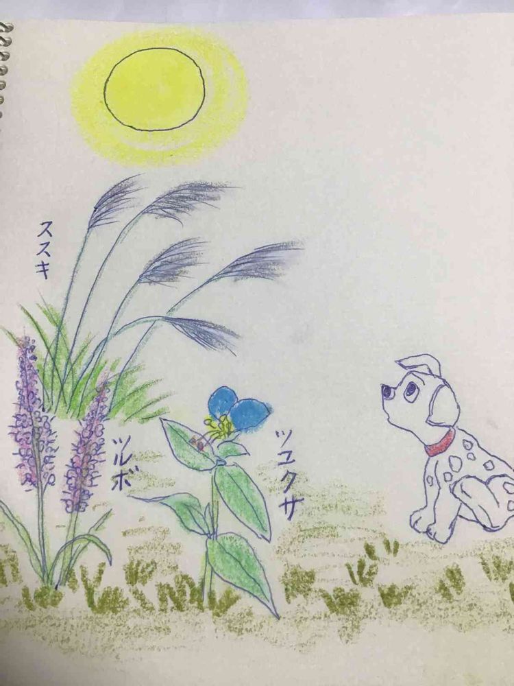 、描いてたら 、あんな展開になりました 。。。 お花は、今 庭で 咲いてるのを 配置し、見上げるワンちゃん🐶 は、 はい、、可愛かった💕ので 101 匹 ワンちゃんから 引っ張って来たら、 何だか 楽しい お月見の