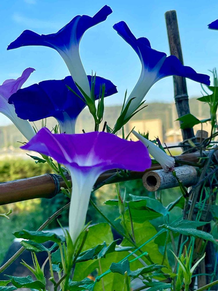 今朝の朝顔は青空に向かって伸び伸び咲いています🍀💜💙