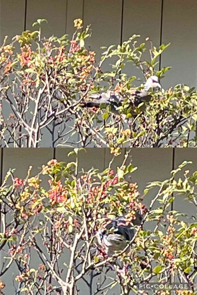 実山椒に毎朝 ハトさんが食事に来ます。トゲが刺さって時々バタつきます。