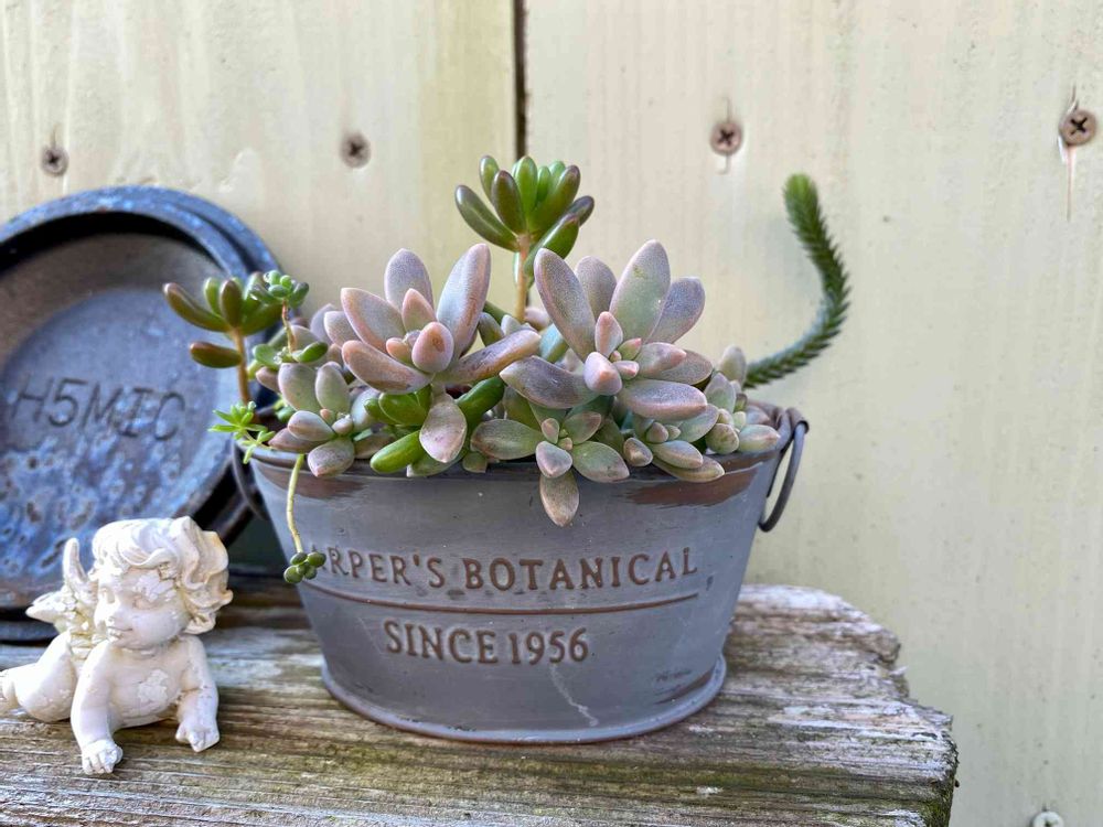 100均の鉢に入れた強い子だけの寄せ植え。雨晒し放置でーす😆