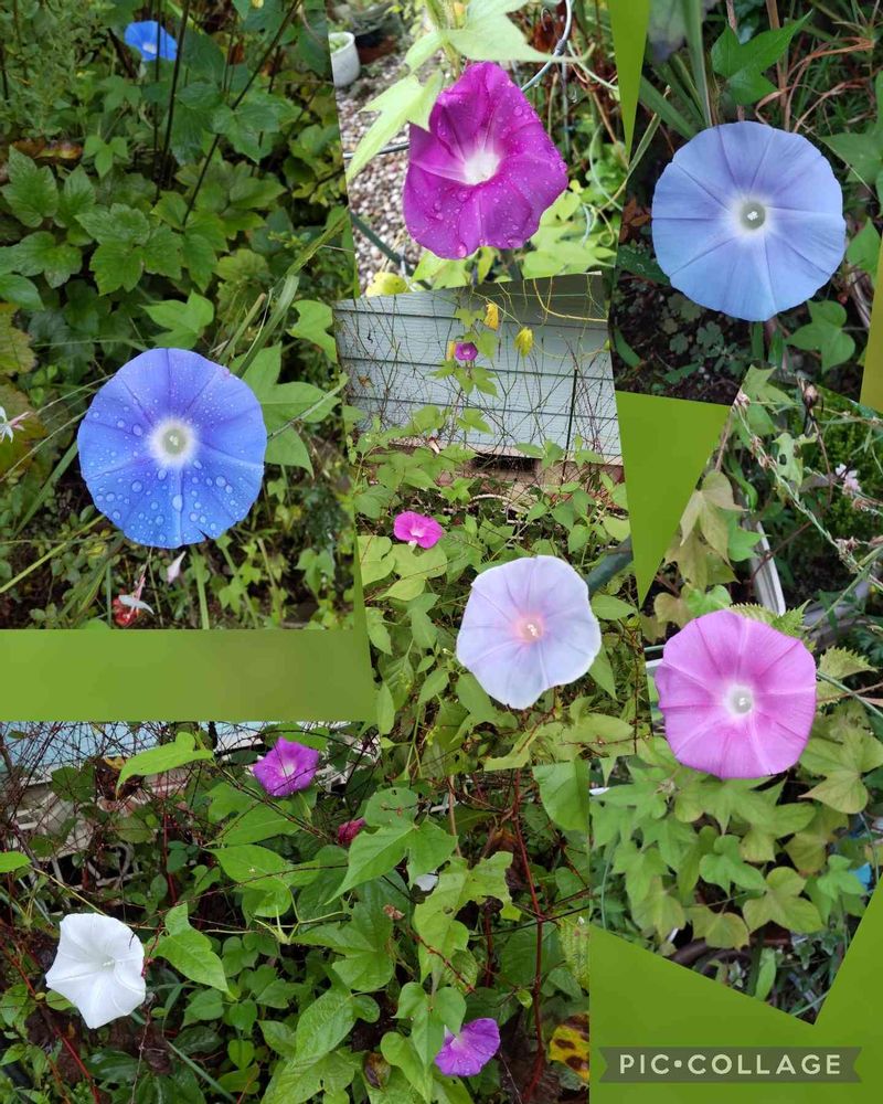 我が家の畑と庭で自由気ままに咲いてる朝顔達💜🤍💙
