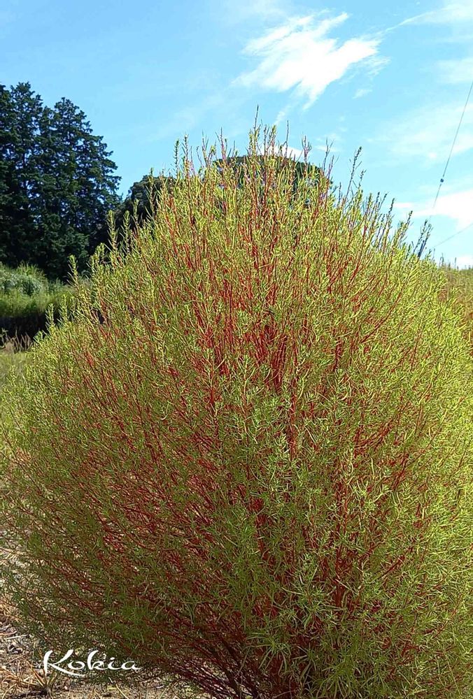夏には鮮やかなグリーンが、少し色づいてきたモフモフ姿のコキア夏から秋へ