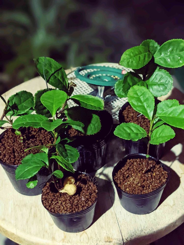 茶の木実生をポットに😁十個撒いて、五個、マアマアかな?🤔