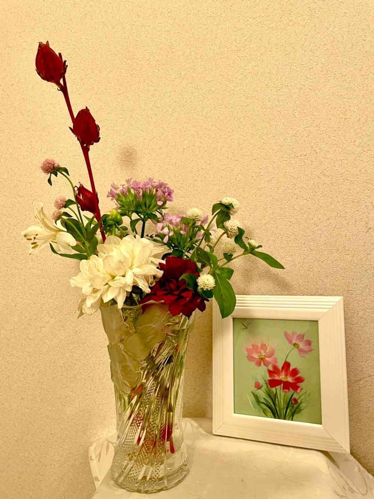娘からもらったお花と混ぜて、相変わらず自己流ですが生けました😅