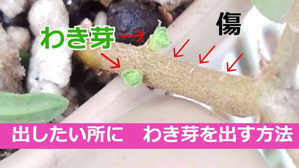 出したい場所の枝に 傷を付けてわき芽を促進させる方法です。