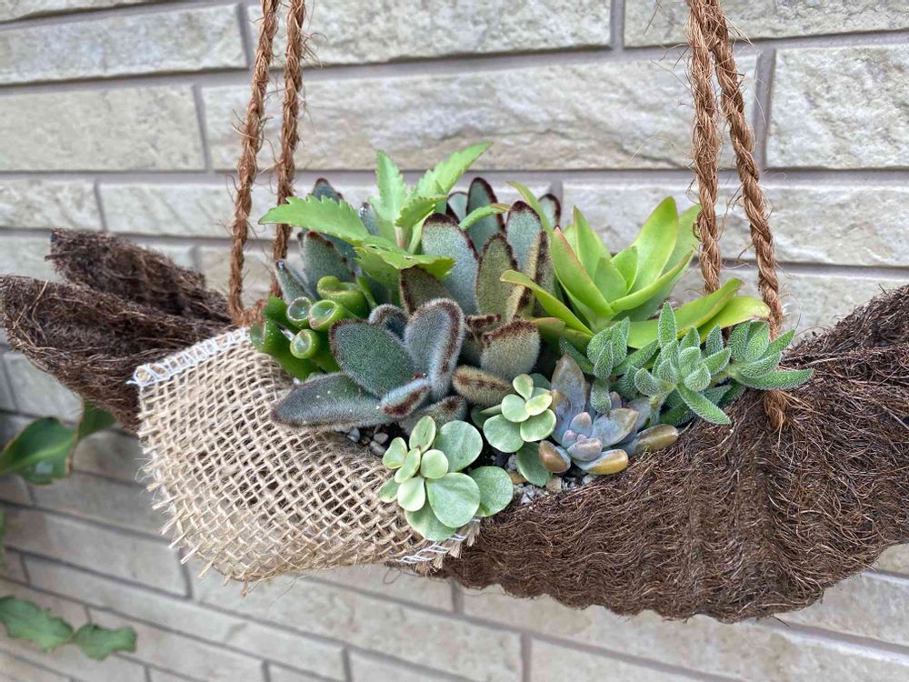 人工杉皮テープとシュロ縄、麻布でハンギングの器を作りました。