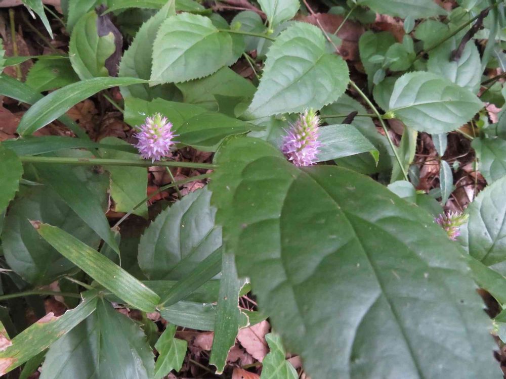 葉の脇に短い円錐花序を出し、紅紫色の花をたくさんつける。