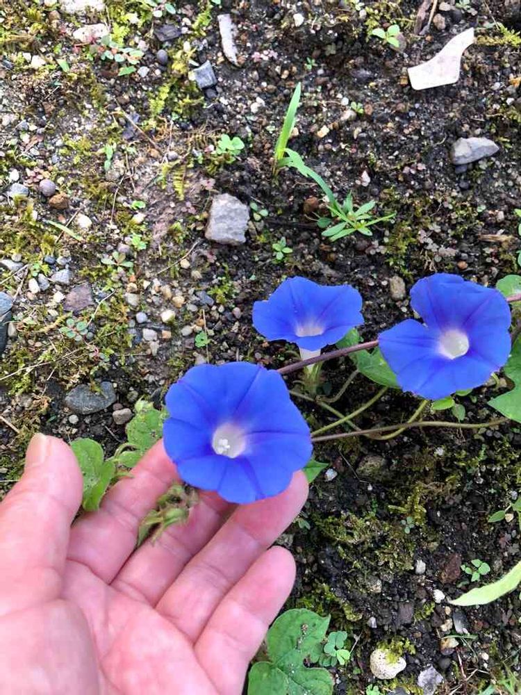 小さい小さいアメリカ朝顔が地面を這いながら可愛く咲いてます