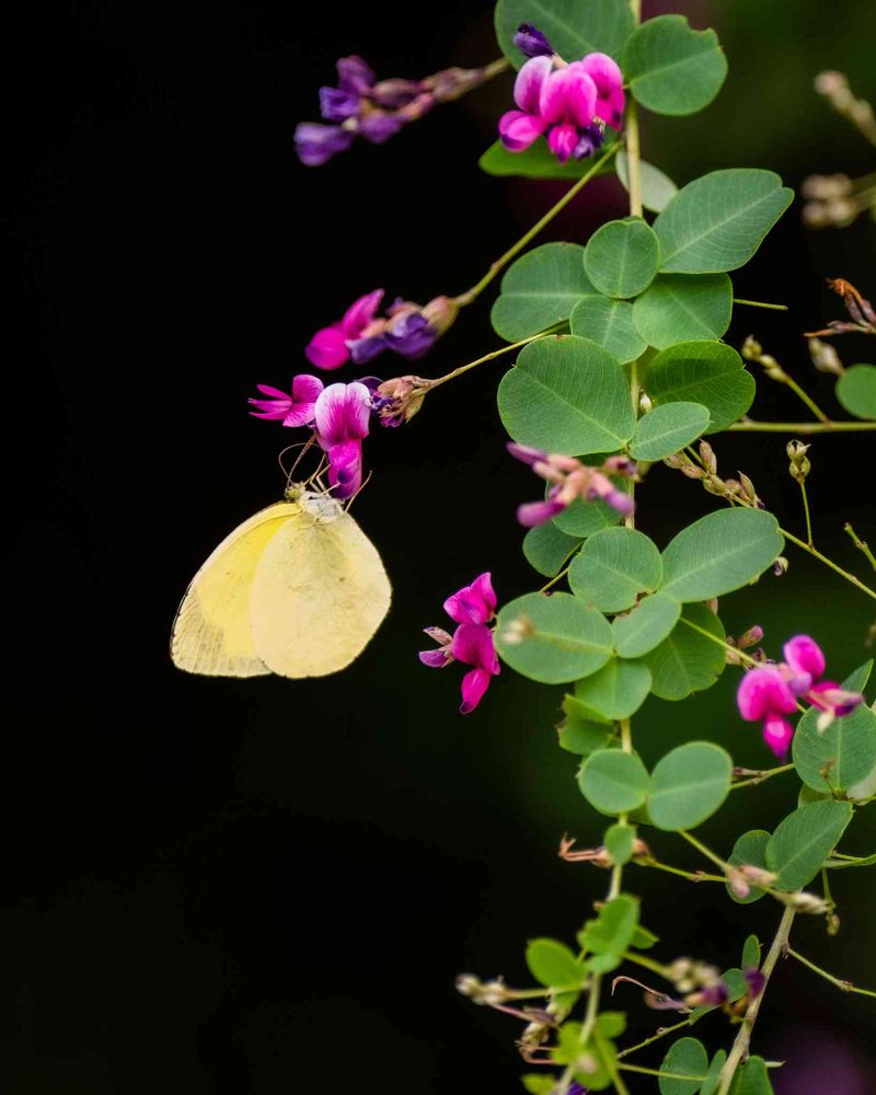 背景が暗くてキチョウとハギの美しさがひき立ちますね。