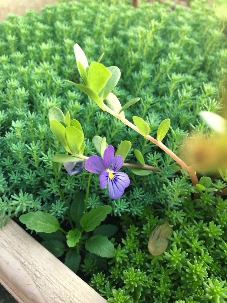 ん?あれ?放置プランターからのぞくお花は、、、ビオラ(≧∇≦)!こぼれ種かしらん。