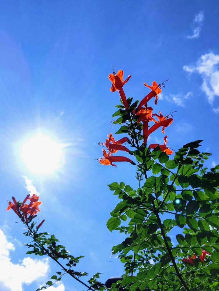 青空にヒメノウゼンカズラの赤い花がすてきでした。