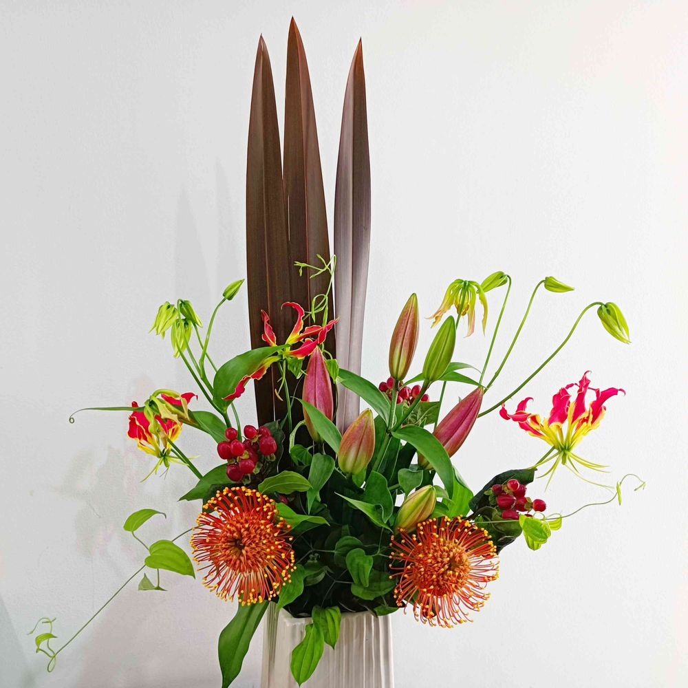 ニューサイラン(赤葉)、グロリオサ、ユリ、ヒペリカム、ピンクッション、利休草