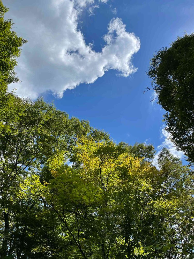 かすかに色付いたモミジは朝日を浴びて輝いてました🍁