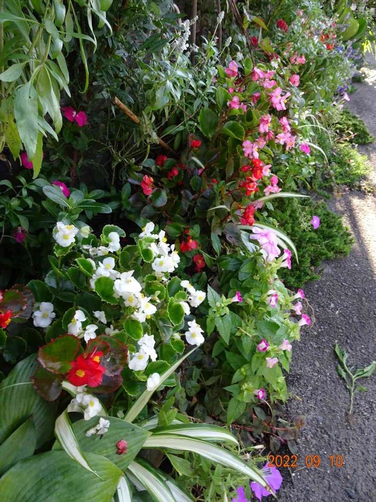 赤、白、ピンクの花が咲いてる素敵な庭ですね!🤗