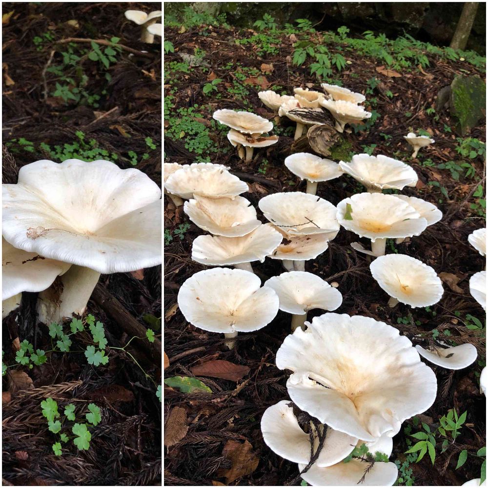 うっそうと茂杉木立の中で 目に止まらないはずがない😱 キノコたち🍄