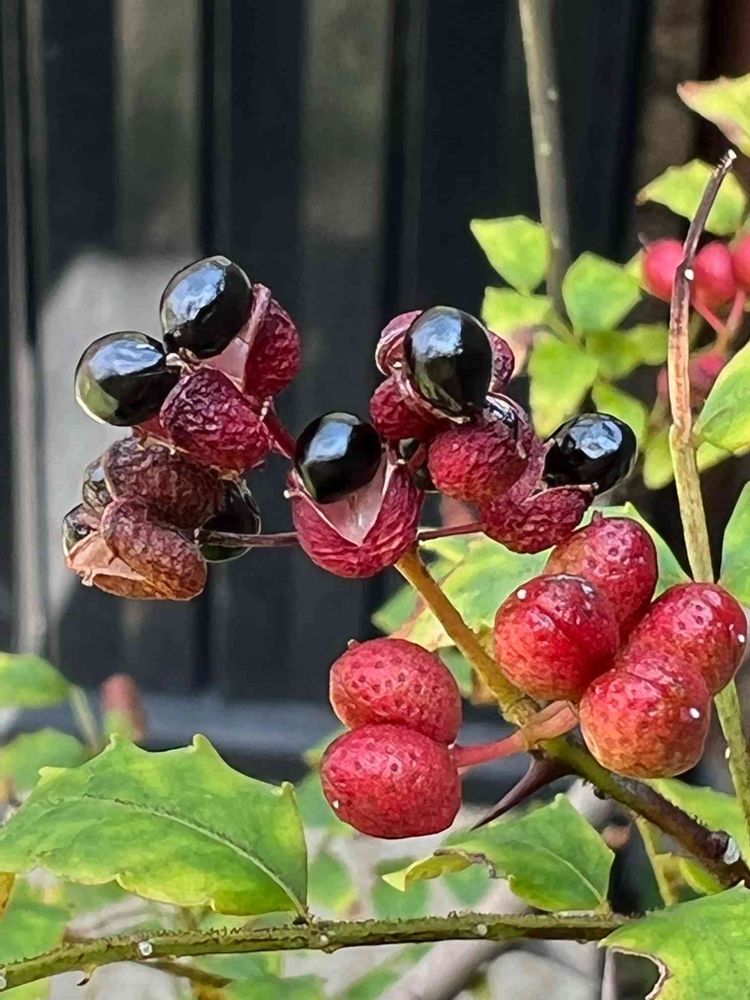 サンショウの実は、そのままして居たらこんなに赤く色付いて黒い種が出て来るのですね😊
