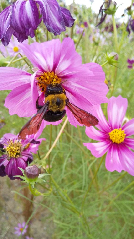 今日のお花「コスモス」と「クマバチ」さんです。🌸🌿🐝😊😄🌞✌️