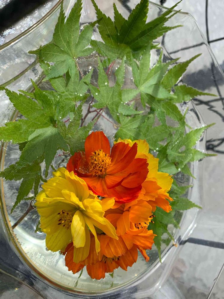 黄色💛オレンジ🧡のコスモスと紅葉が可愛い花手水☘️☘️☘️
