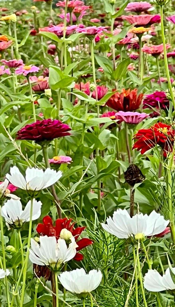 白のコスモス✨💕素敵ですね(*^▽^)/★*☆♪💕💕ジニアも沢山咲いて良いね😃💕