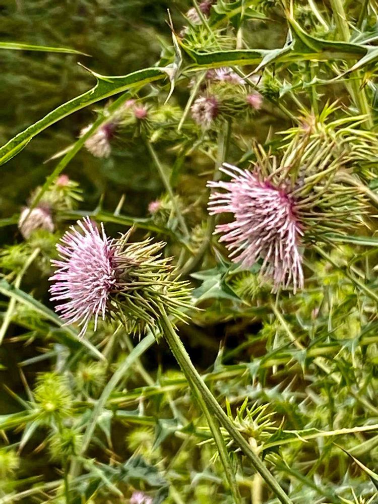 地域山いつもの1300辺にトゲトゲの、苗の時、葉っぱの白いラインがメチャ目立ってたアザミ、咲き出しまし❤️